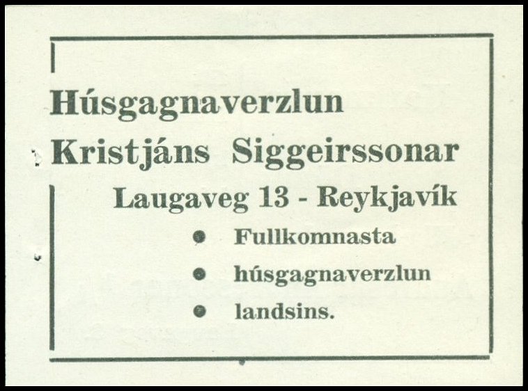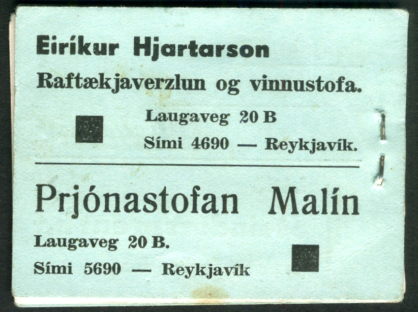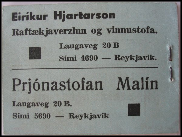 Werbung "Eirikur Hjartarson + Prjónastofan Malín": oberer Teil Hausnummer ohne Punkt (Laugarveg 20 B), Telefonnummer 4690 (Reykjavík mit Punkt), unterer Teil Hausnummer mit Punkt (Laugarveg 20 B.), Telefonnummer 5690 (Reykjavík ohne Punkt). Diese Version gibt es auch bei Heft 5G.
